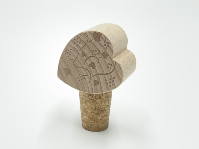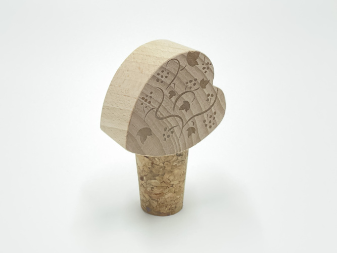 Ce bouchon de bouteille en liège est décoré d’un cœur en bois finement découpé et gravé avec un motif de vignes, inspiré de l’univers viticole et des traditions alsaciennes.