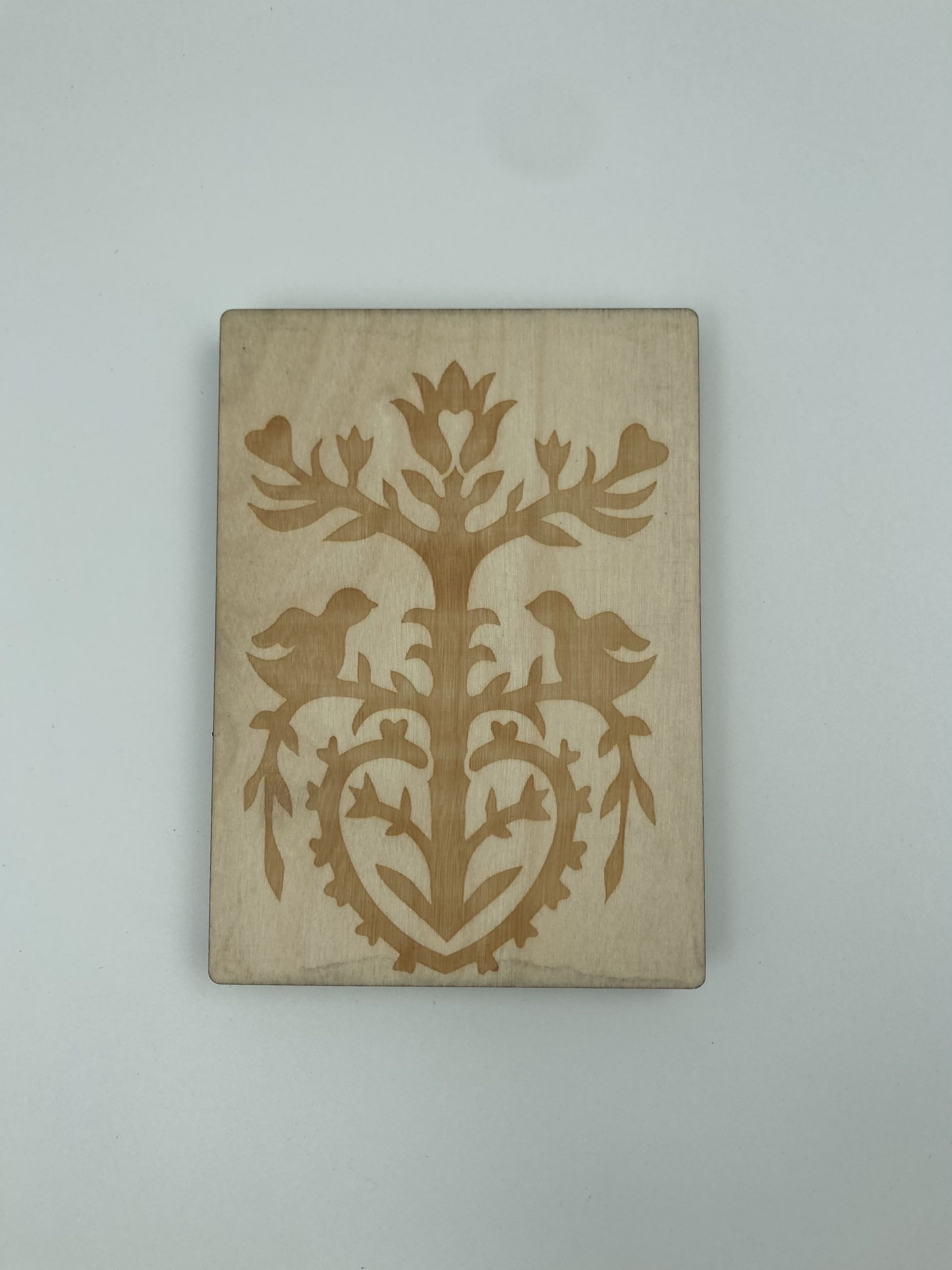 Pour ses petits carnets, Alsatrucs a réalisé une couverture plaquée de bois de peuplier gravé de motifs évoquant les Arts et traditions populaires d’Alsace.