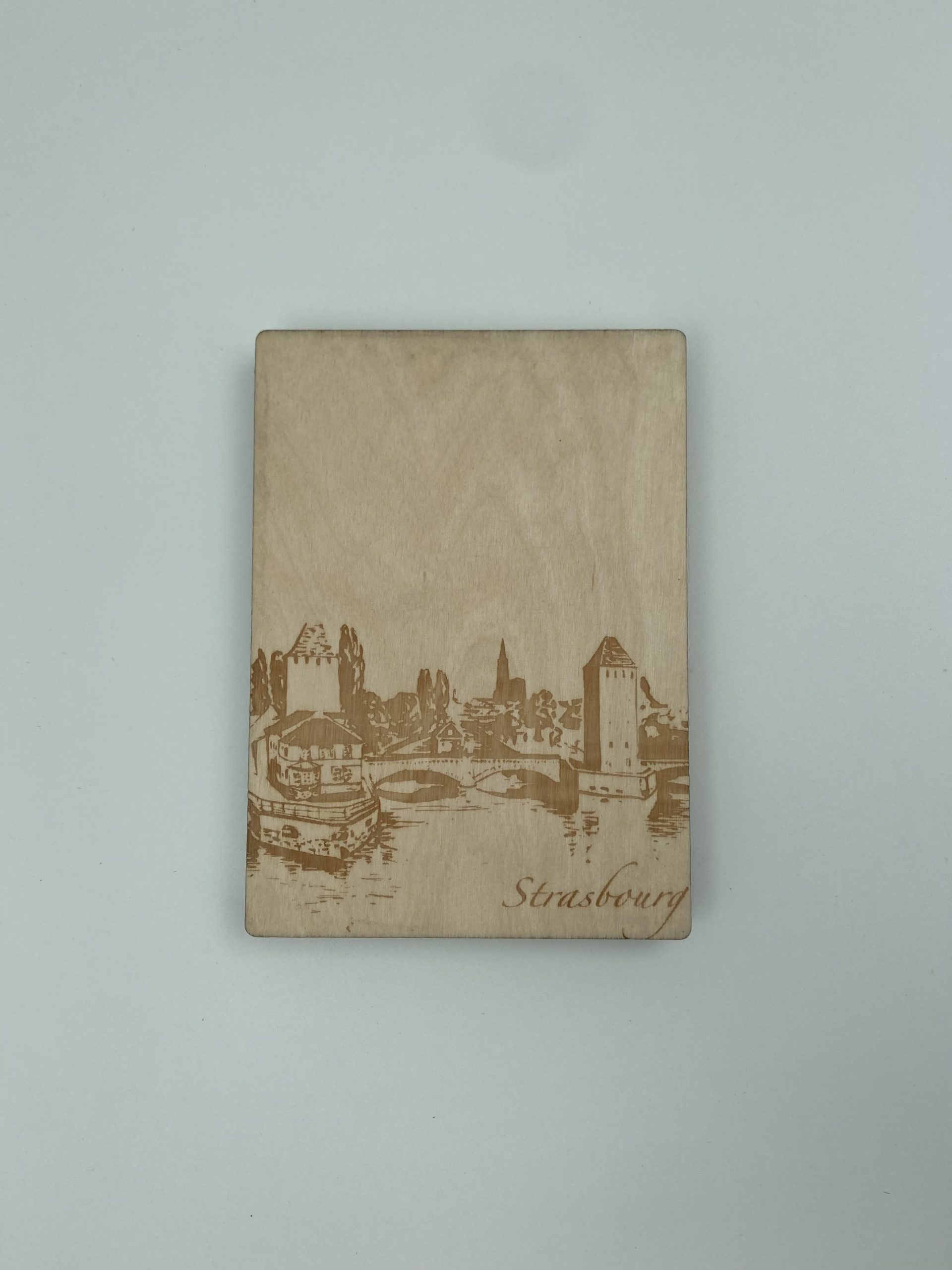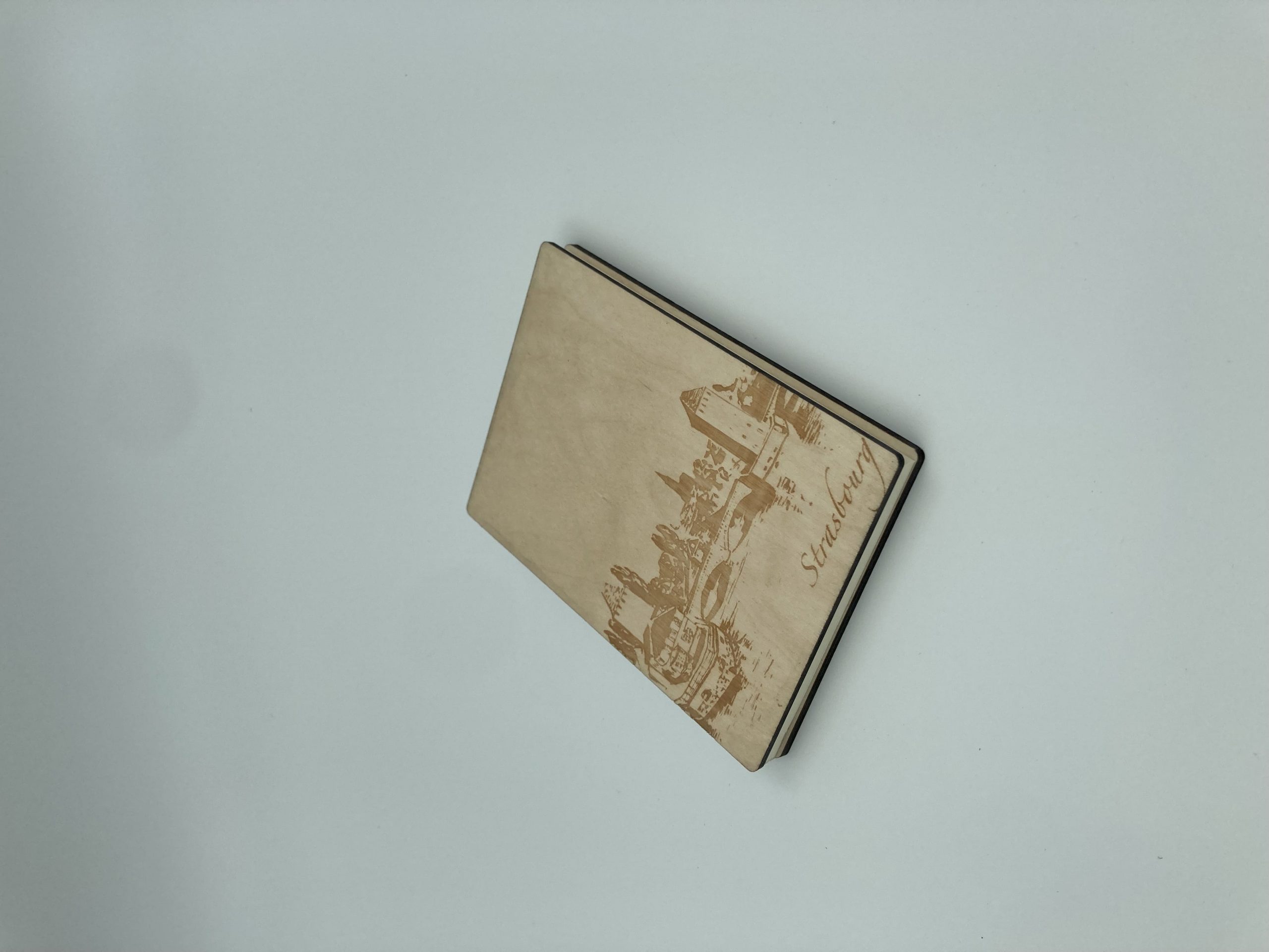 Des carnets à la couverture en bois de peuplier gravé, inspirés de l’univers alsacien.