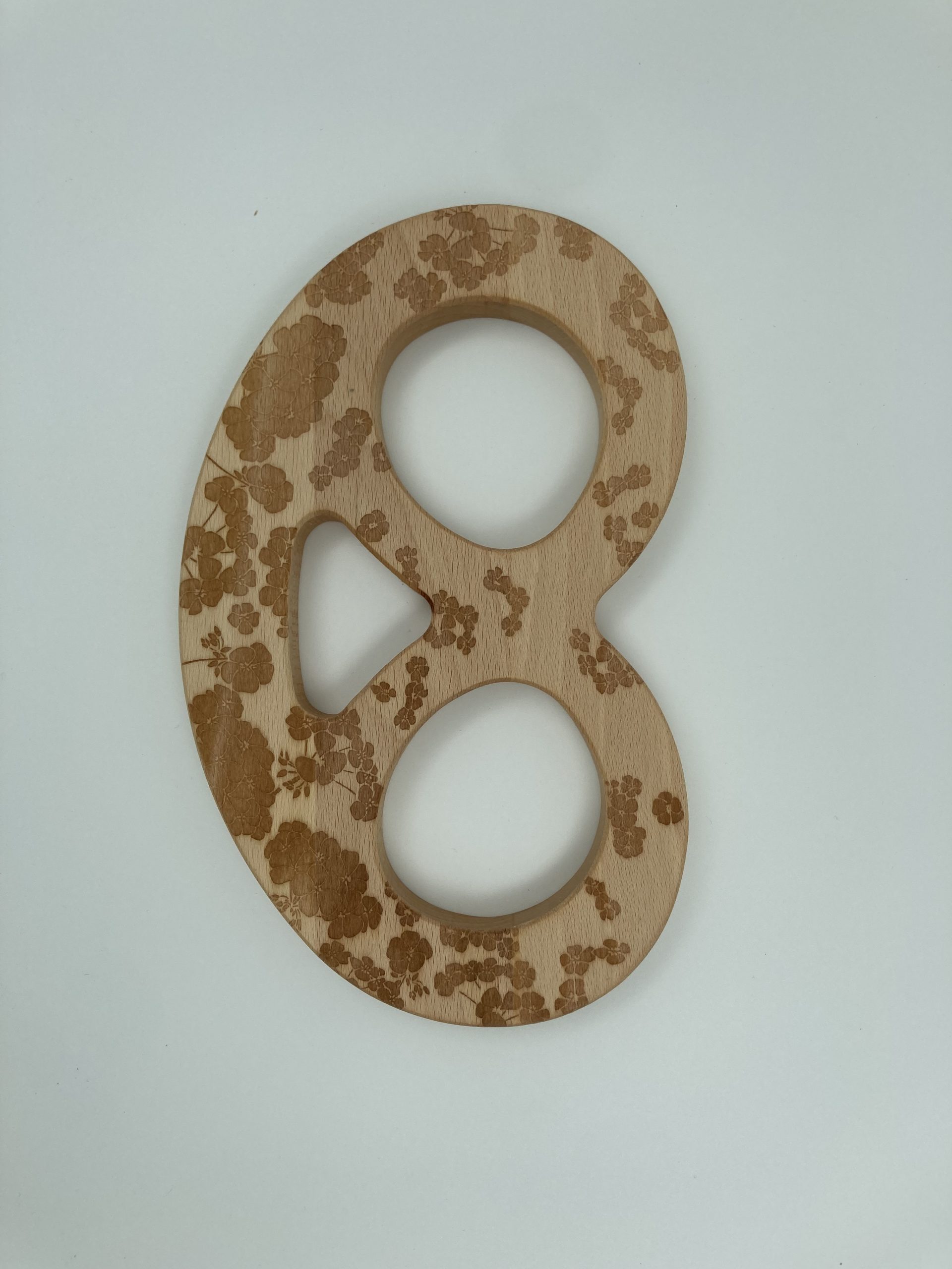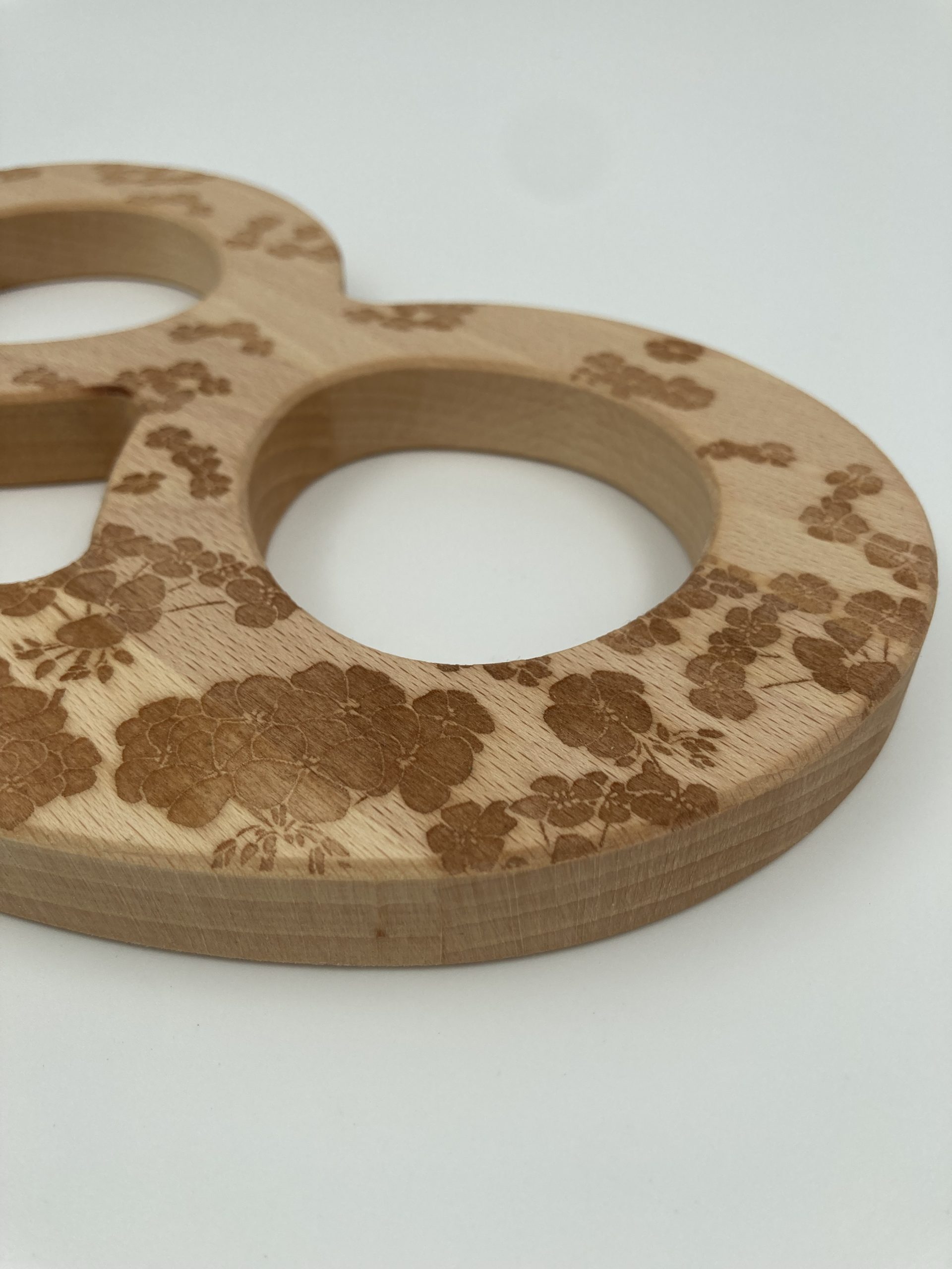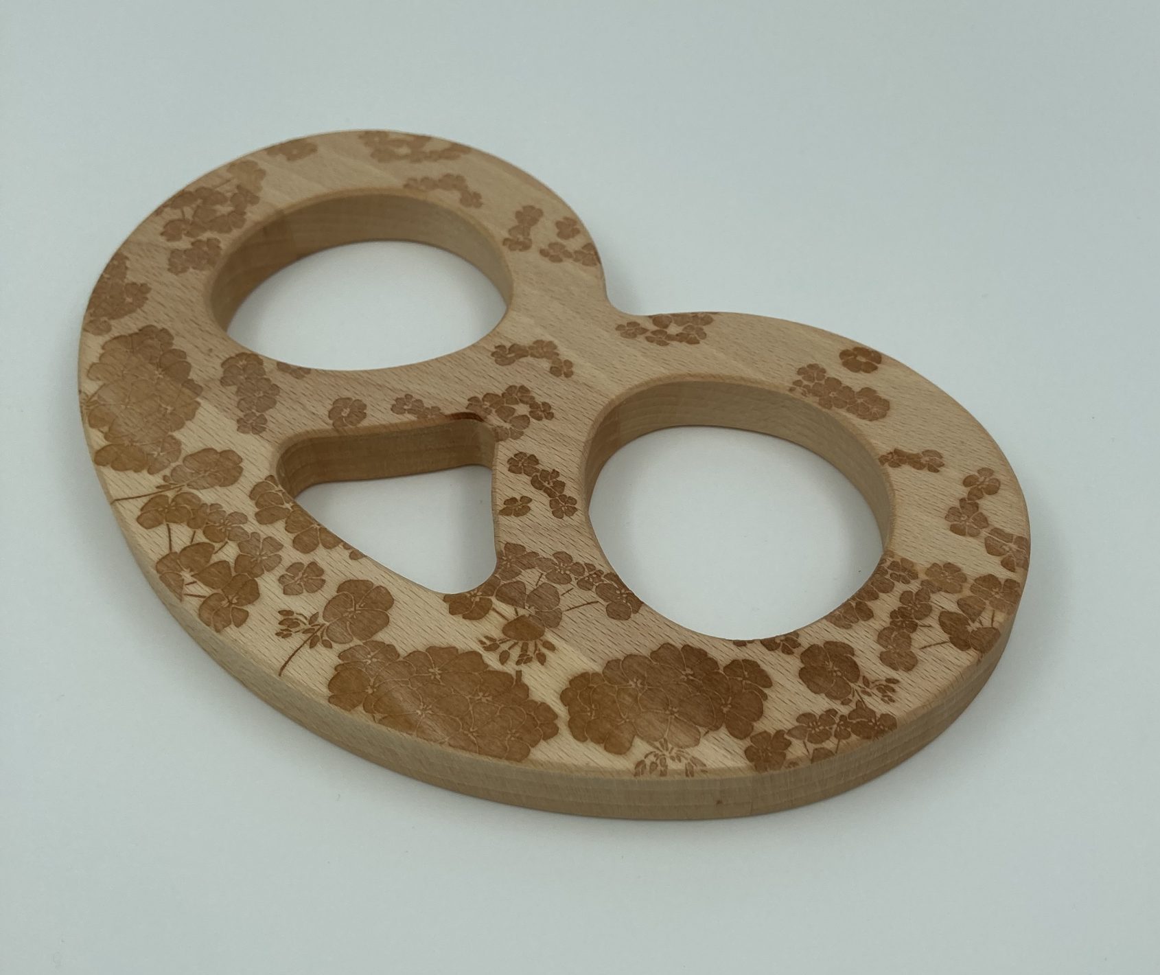 Dessous de plat en bois en forme de Bretzel, couleur naturelle avec une impression laser « fleur de cerisier ».