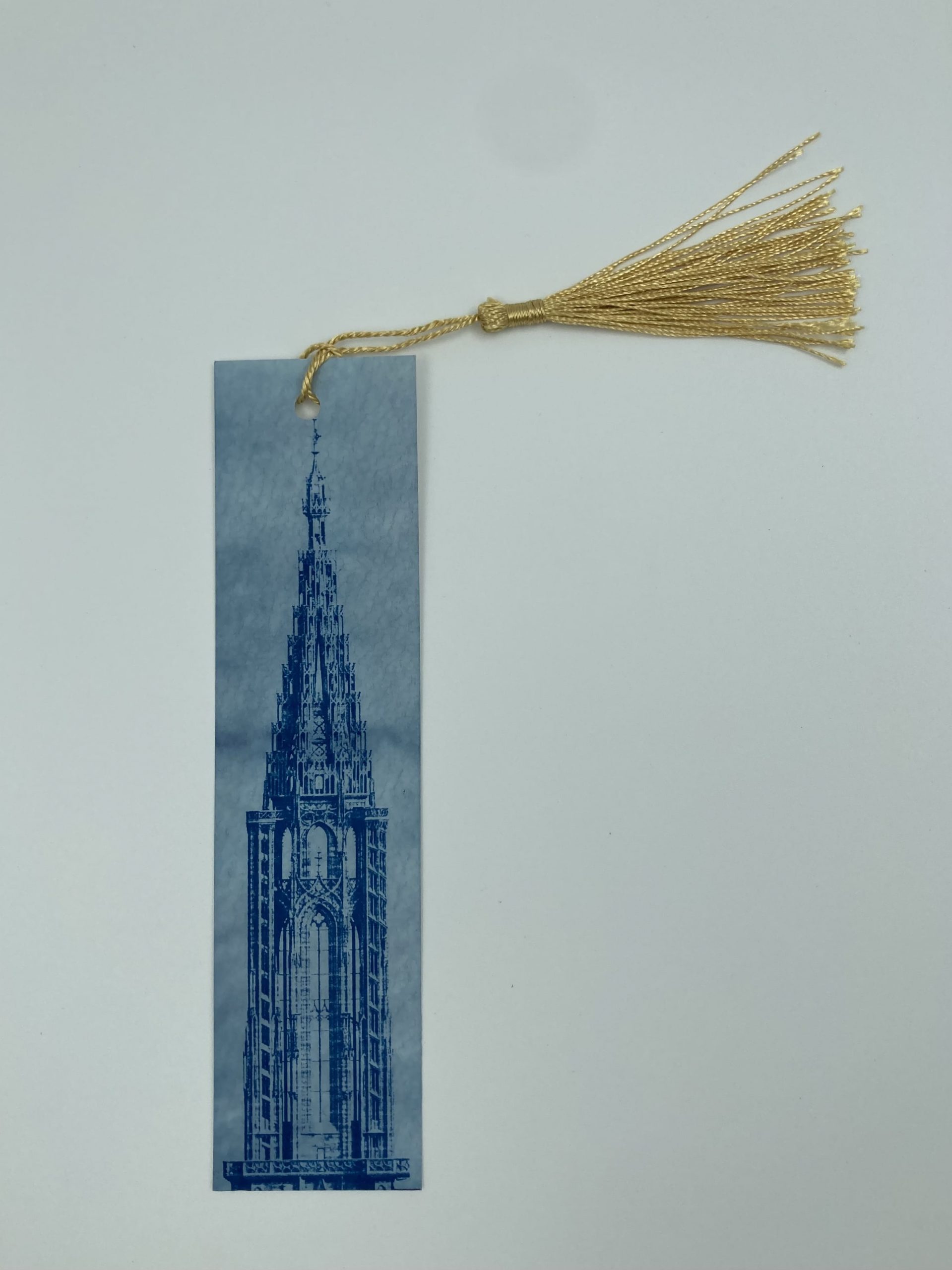 Marque-page en cyanotype, réalisé artisanalement sur papier aquarelle Lana. Chaque pièce est révélée à la lumière pour faire apparaître les motifs dans les nuances caractéristiques de bleu. Finition élégante avec pompon doré.