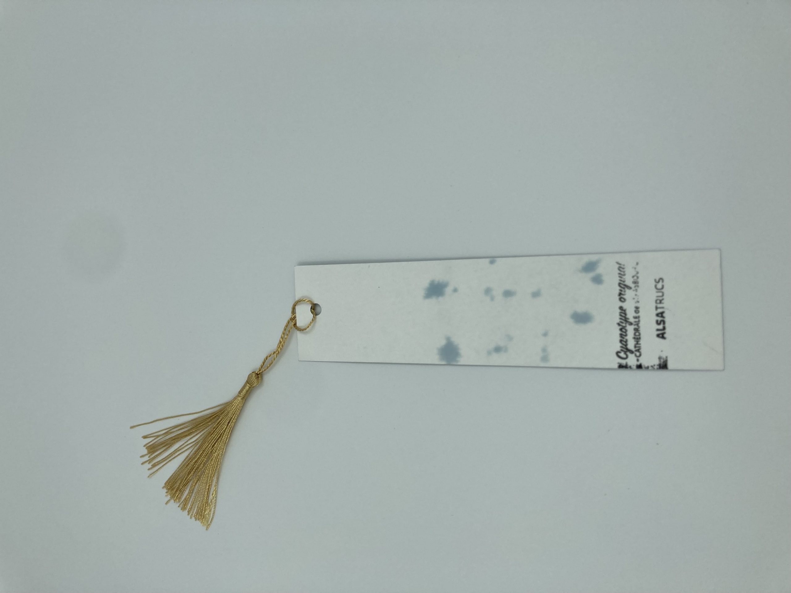Des marque-pages réalisés artisanalement en cyanotype sur papier aquarelle Lana, par Côme, le benjamin de l’équipe ateliers.