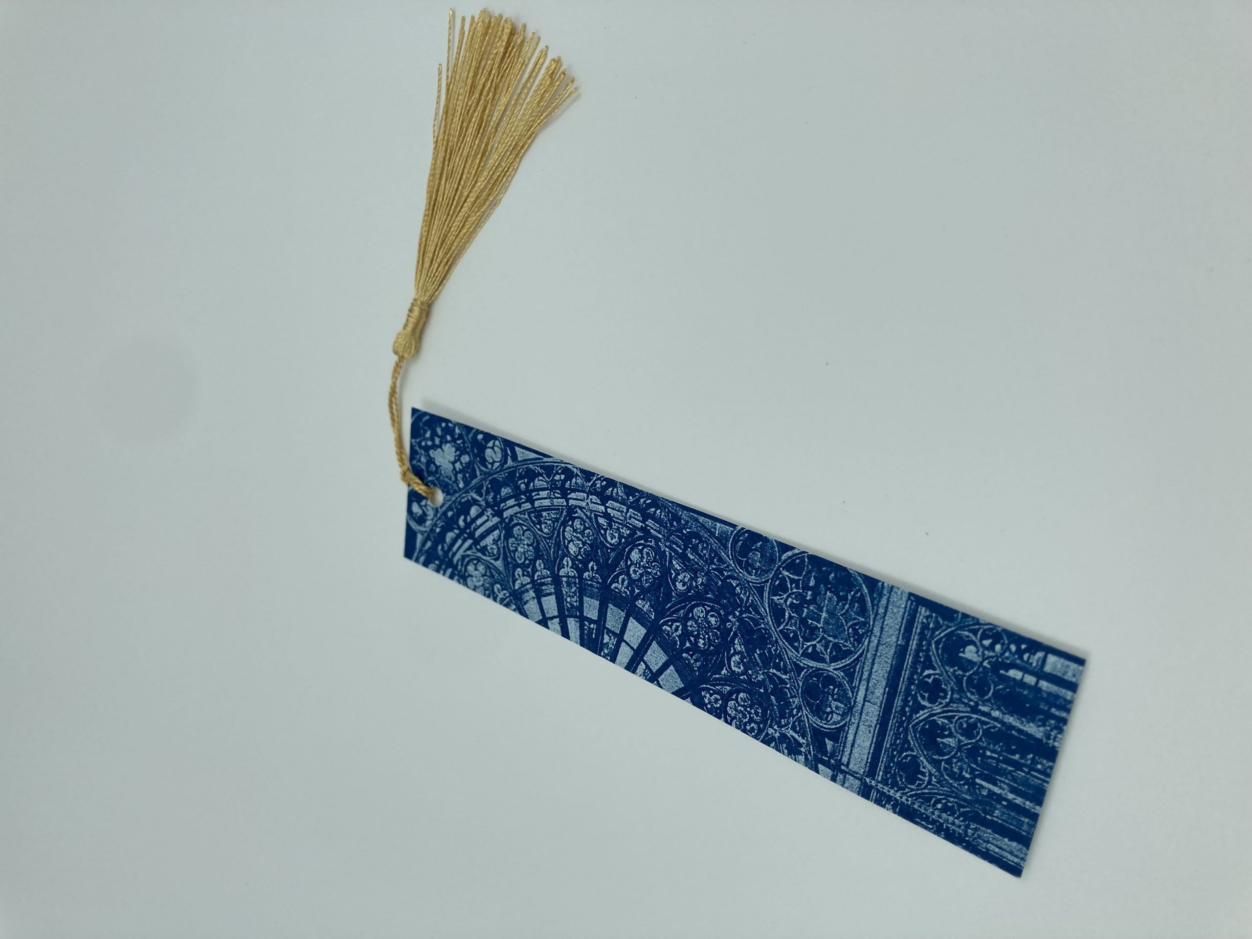 Marque-page en cyanotype, réalisé artisanalement sur papier aquarelle Lana. Chaque pièce est révélée à la lumière pour faire apparaître les motifs dans les nuances caractéristiques de bleu. Finition élégante avec pompon doré.