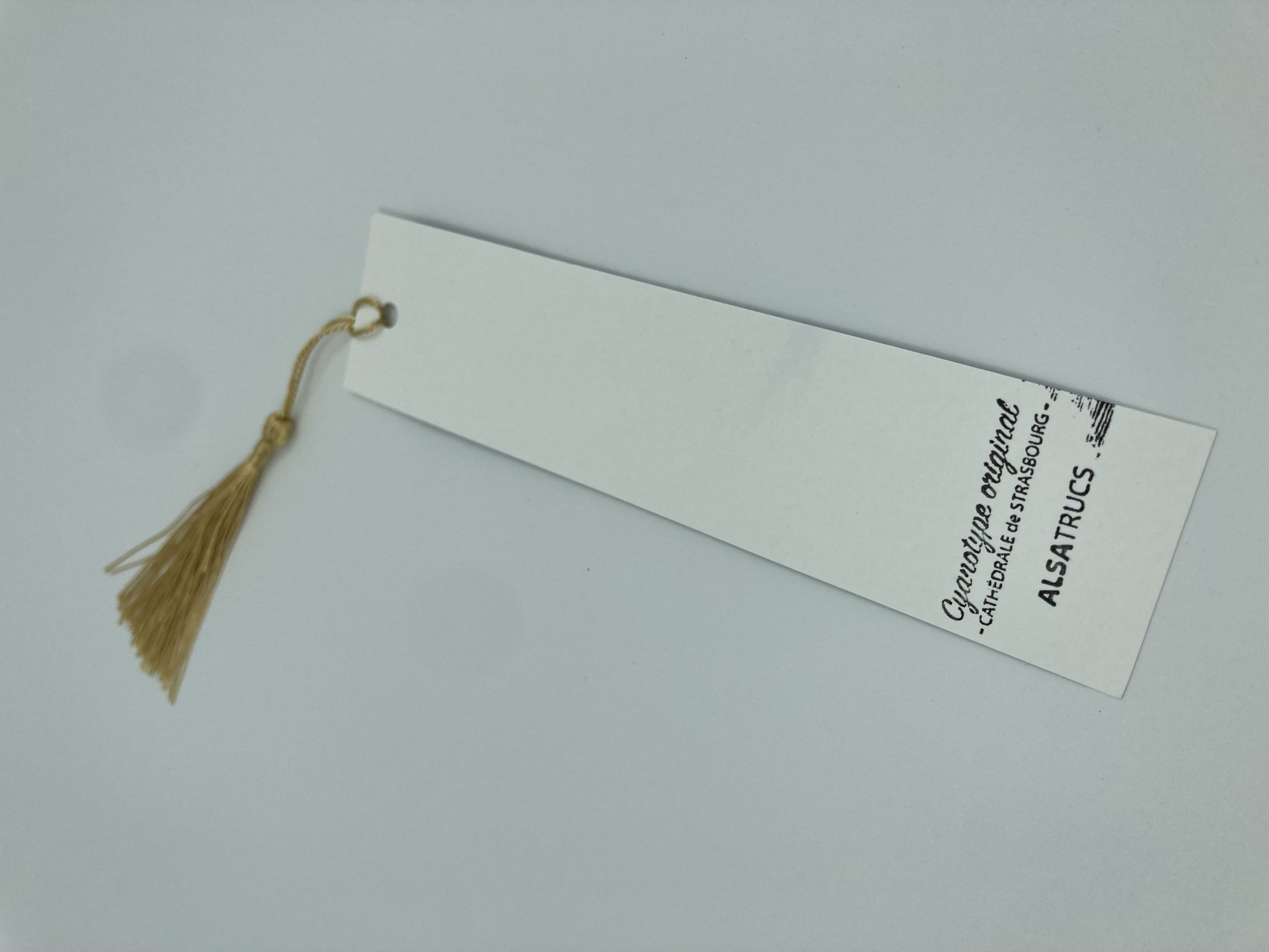 Des marque-pages réalisés artisanalement en cyanotype sur papier aquarelle Lana, par Côme, le benjamin de l’équipe ateliers.