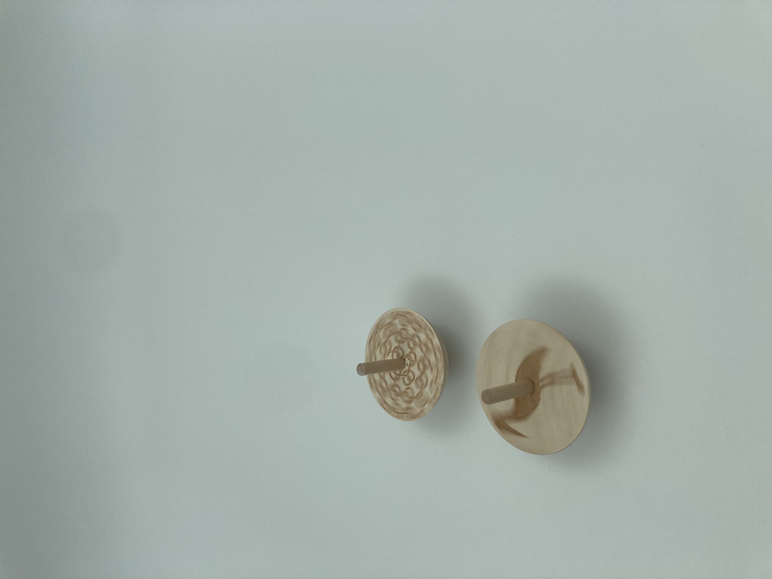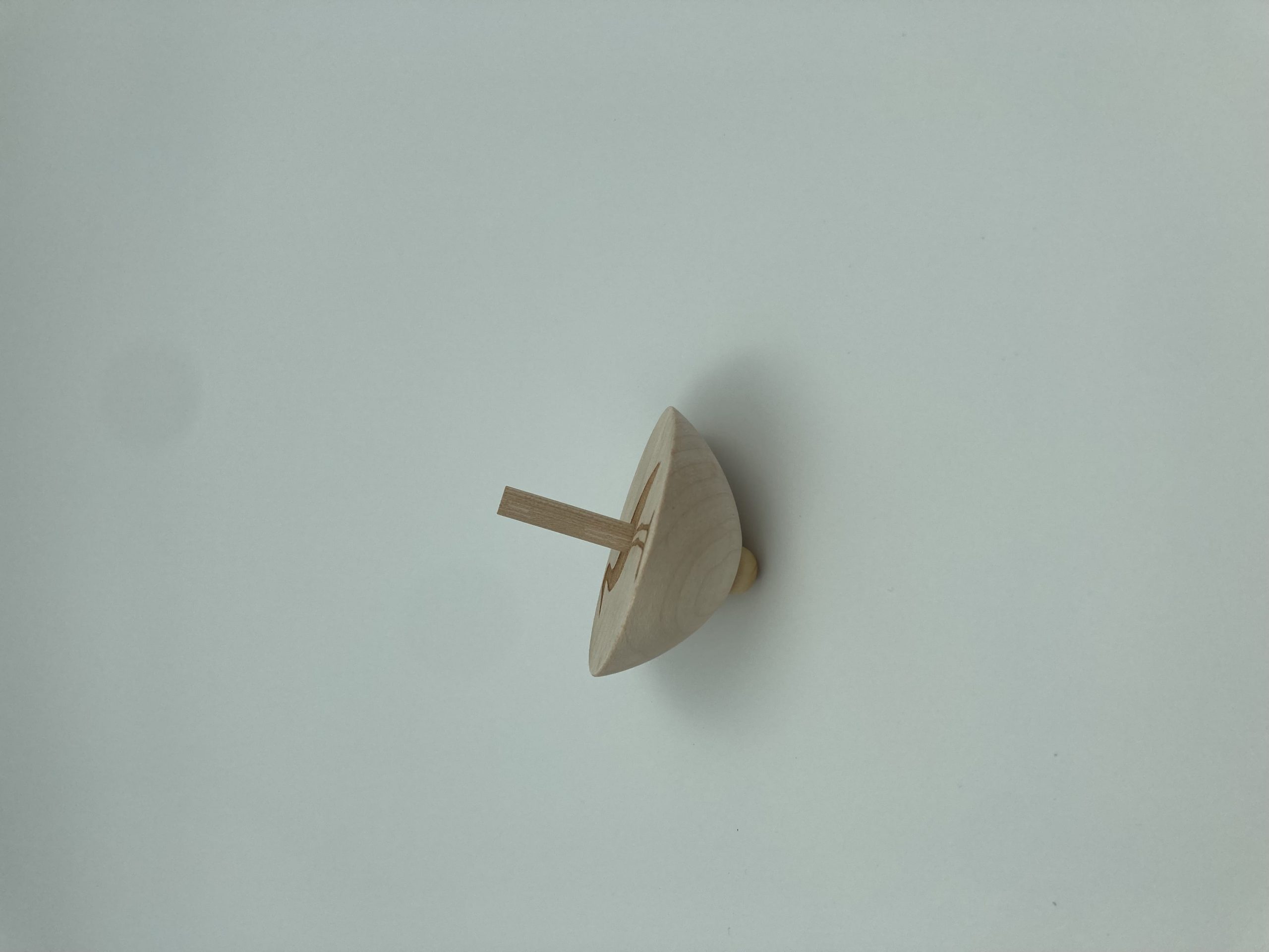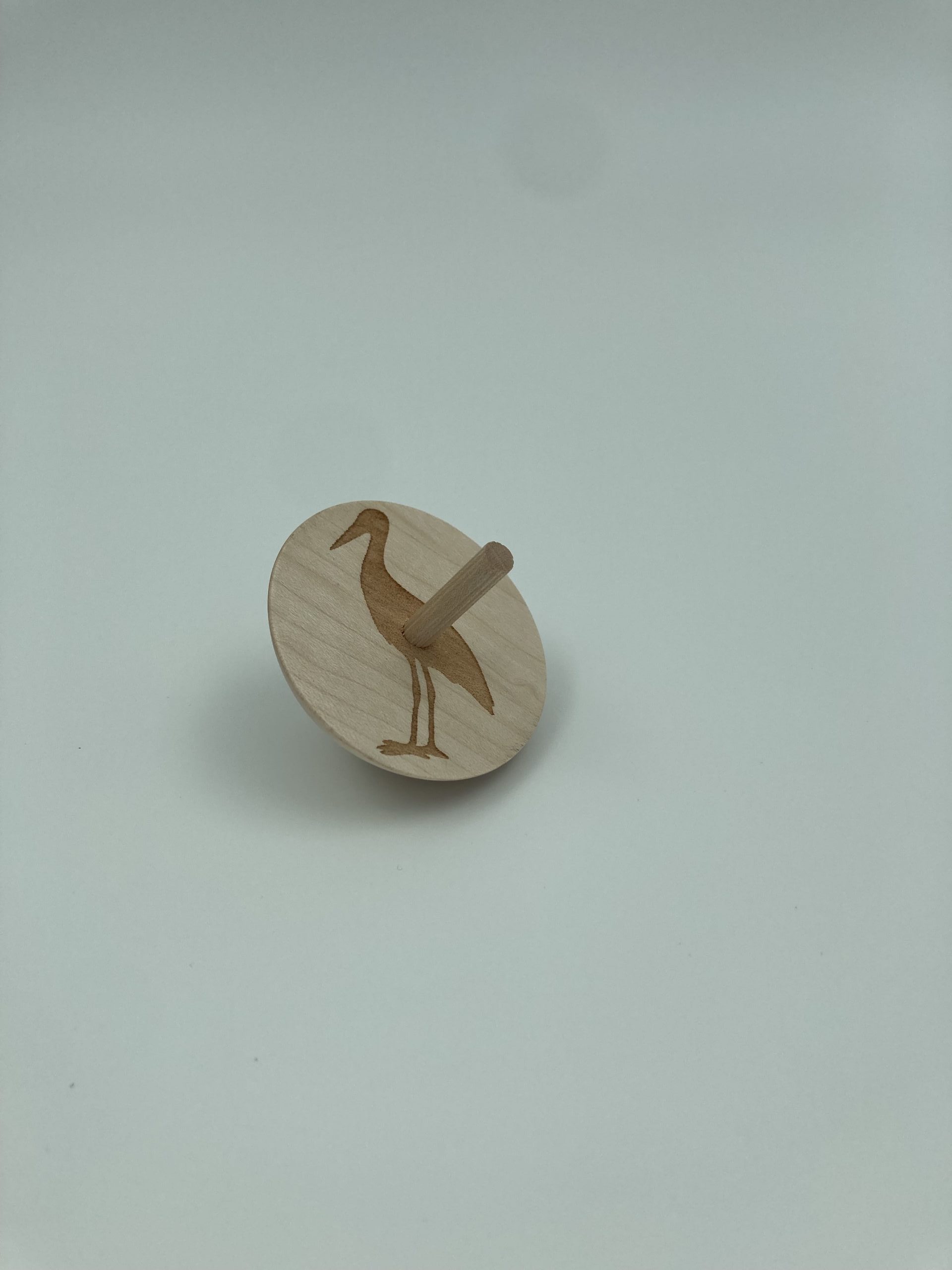 Une toupie en bois finement gravée représentant une cigogne, symbole emblématique de l’Alsace.